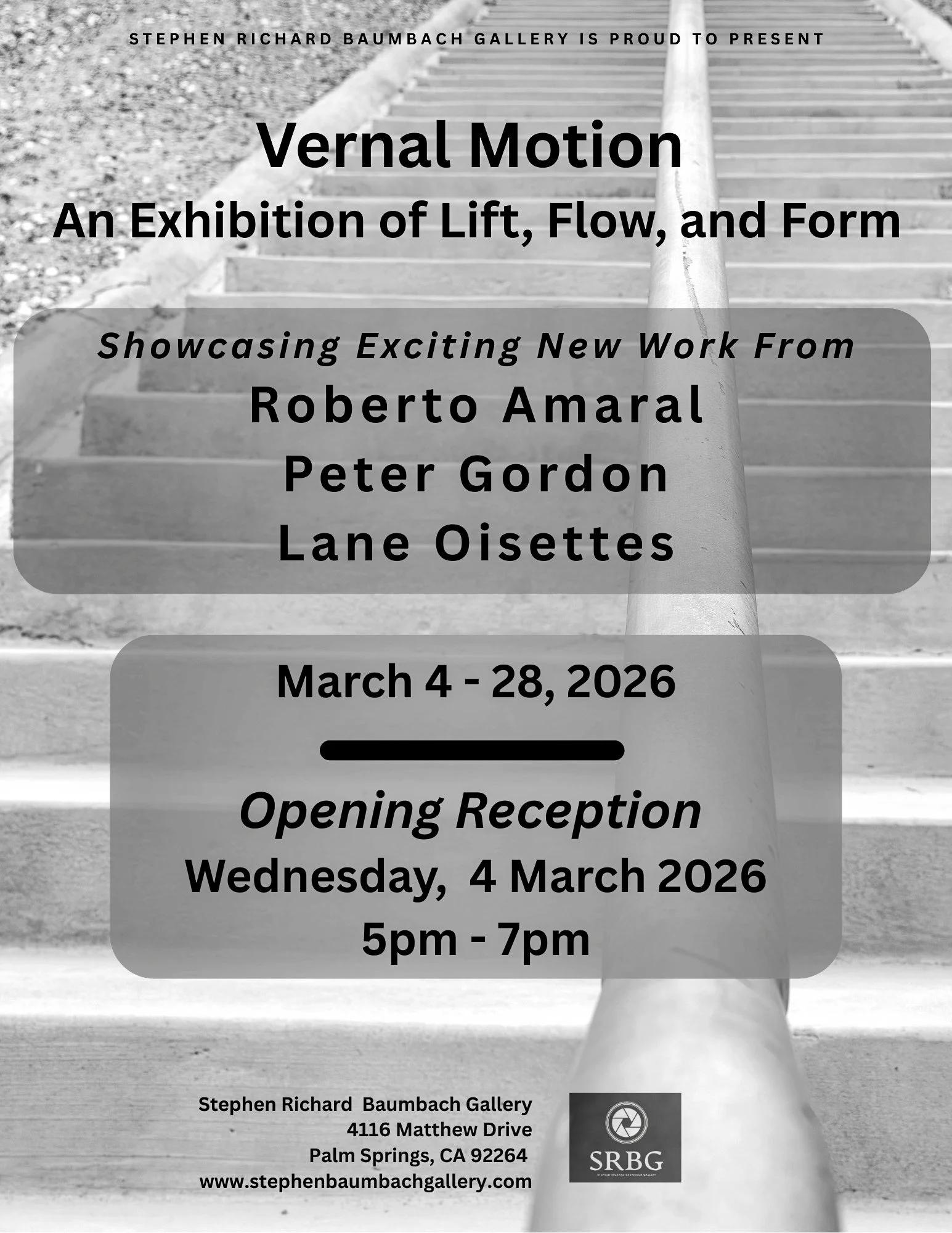 “Vernal Motion” presents new work by Lane Oisettes, Roberto Amaral, and Peter Gordon. The exhibit is open March 4–28, Monday through Friday and on select Saturdays. Join us to celebrate the changing seasons and the renewed energy and fresh beginnings of spring.